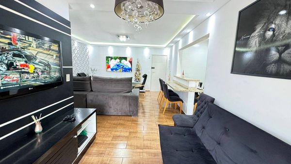 Apartamento à venda na Guilhermina semi-mobiliado em Praia Grande/SP. Belíssimo apartamento de 02 dormitórios sendo 2 suítes + lavabo sala ampla, sacada com churrasqueira, cozinha ampla. 100m² de área útil. 01 vaga de garagem. Lazer completo Agende sua visita.